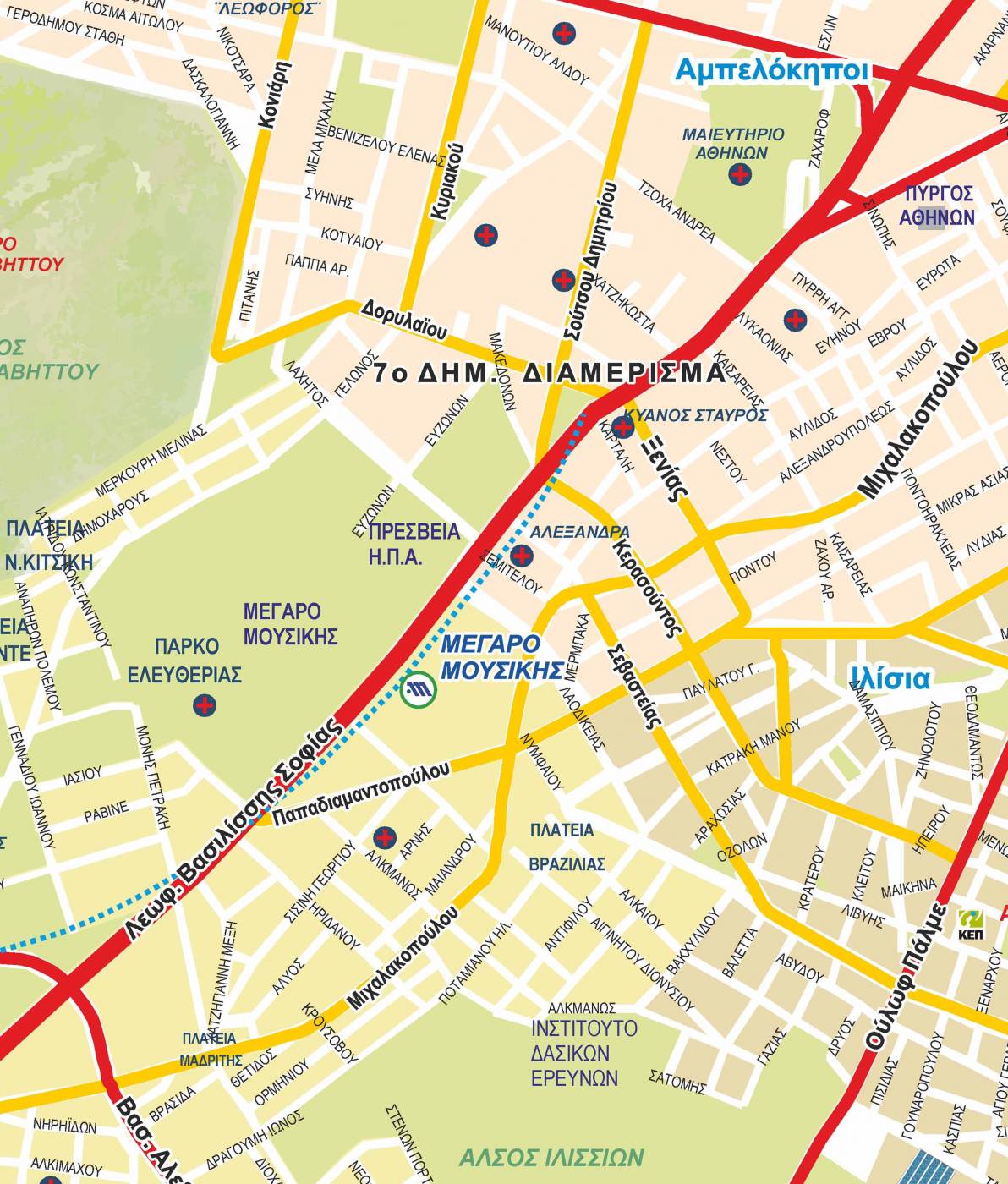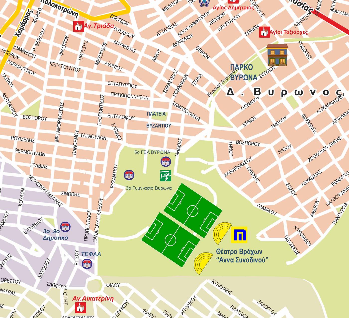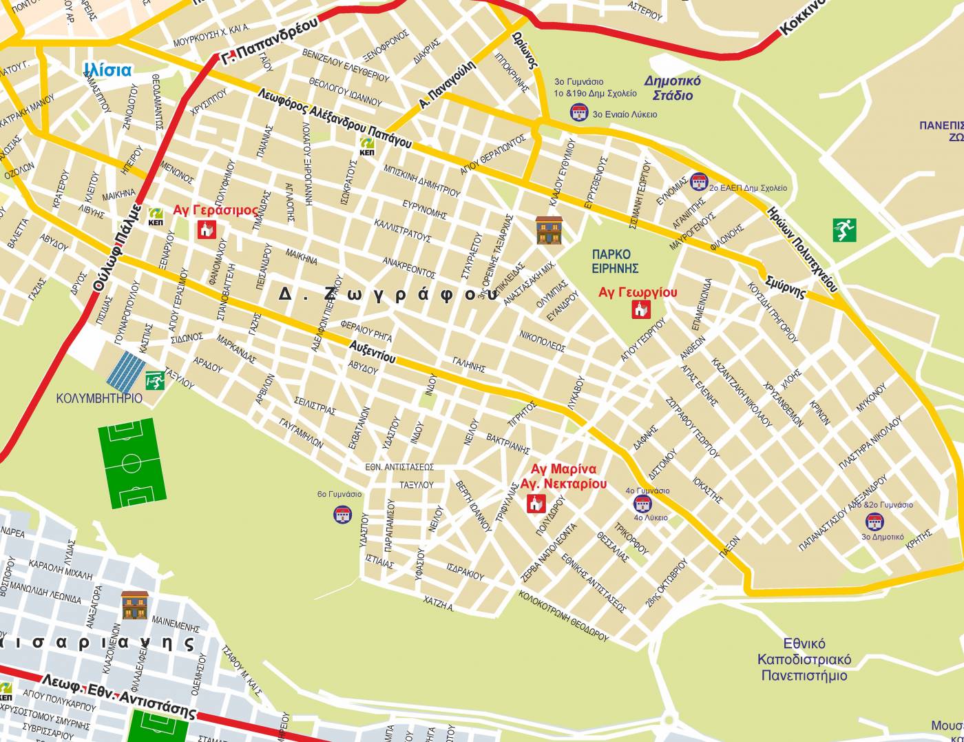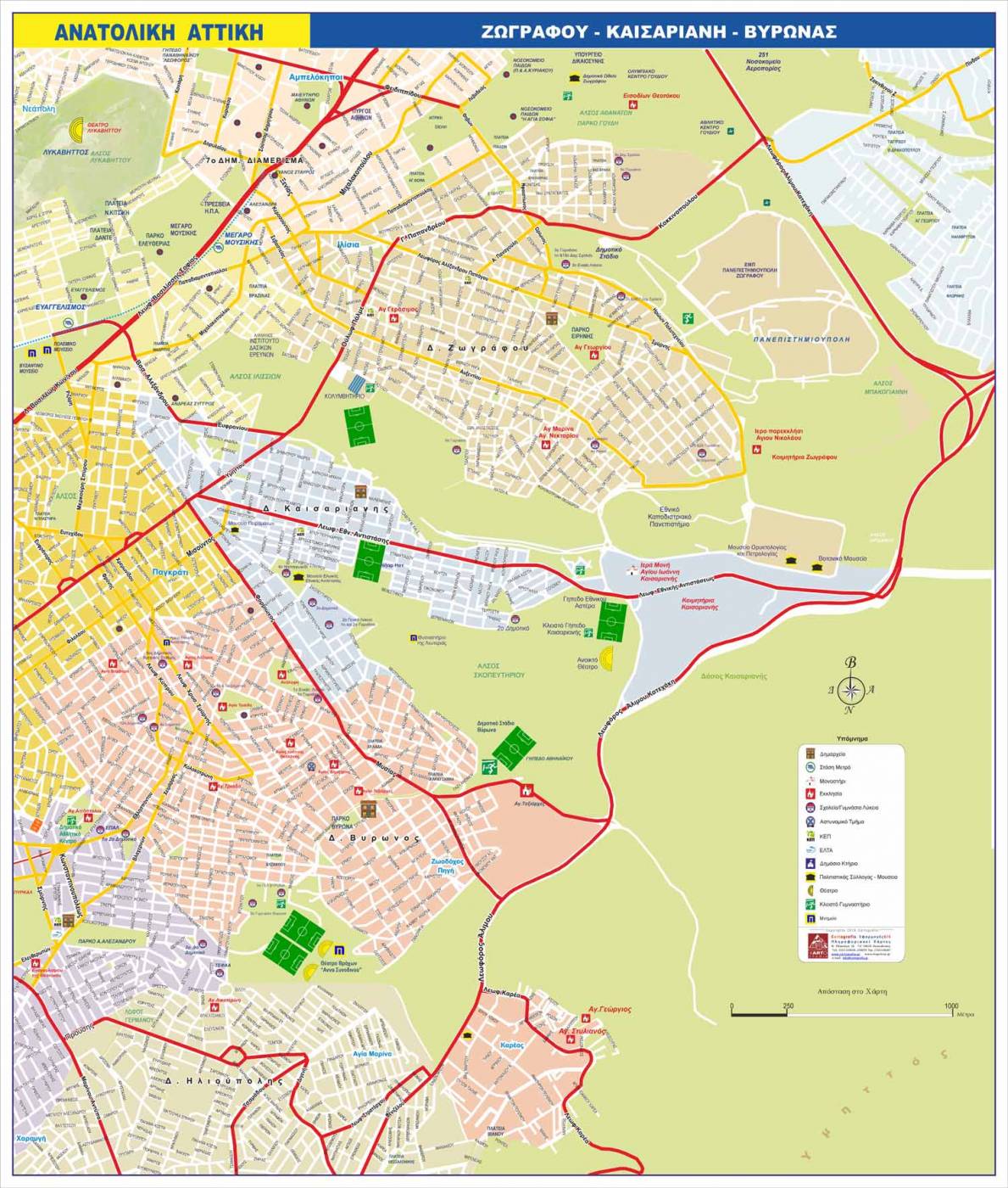 Χάρτης της Ανατολικής Αττικής με τους Δήμους Ζωγράφου, Καισαριανής και Βύρωνα με τα βασικά σημεία ενδιαφέροντος.